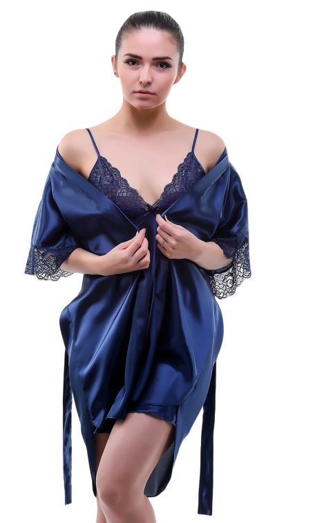 Легкий однотонный халатик покроя кимоно, с запахом под пояс. Рукав короткий с нежным прозрачным кружевом по низу. Соответствие размеров: XXL - 54-56, XL - 50-52, F - 42-50.