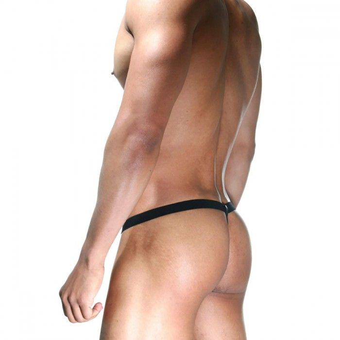 Мужские черные трусы-стринги, на широкой резинке. Спереди гульфик для мошонки держится на трех металлических серебристых кольцах.