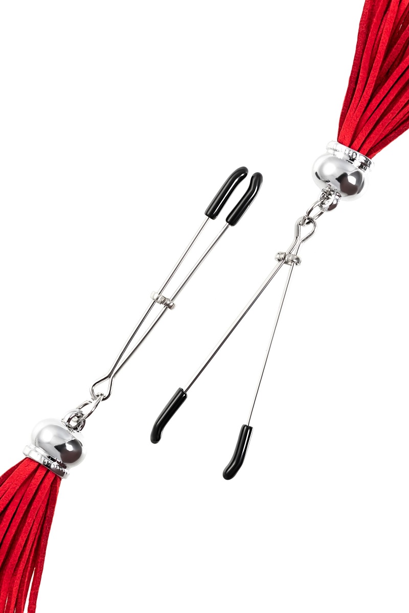 Попробуйте новые, дерзкие ощущения глубокого наслаждения! Зажимы-вилки от Pecado гарантируют смешение ярких чувств от тактильного контакта с нежной кожей сосков. Зажимы выполнены из высококачественных материалов. Металлическая часть компактная, приятная на ощупь. На концах черные резиновые наконечники, для безопасного воздействия на эрогенные зоны. Интенсивность сжатия аксессуара регулируется миниатюрными колечками. В зависимости от личных предпочтений и сценария игры, можно выбрать легкое пощипывание, или сильное сдавливание. Бахрома из натуральной замши, в насыщенном красном цвете, добавляет манящую красоту смелому атрибуту. При каждом соблазнительном покачивании груди, кисточки движутся в пикантном ритме. Также подходит для стимуляции и возбуждении в области половых губ и клитора.
