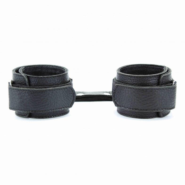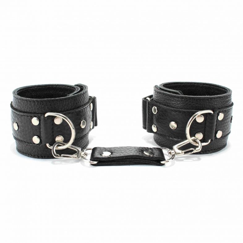 Кожаные наручники черного цвета. Украшены заклепками и соединяются между собой цепью с карабинами. Размер наручников регулируется при помощи застежки-липучки Ширина - 5 см. Длина цепочки - 15,5 см.