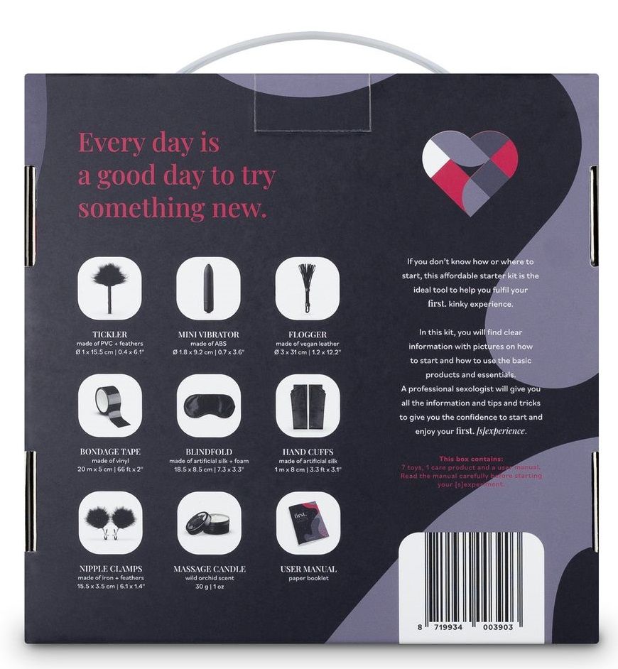 First Kinky Experience - идеальный стартовый набор для тех, кто интересуется БДСМ, но практически не имеет опыта. Эта коробка идеально подходит для пар и содержит удивительное, полное наполнение для многих захватывающих вечеров в спальне. Красивый дизайн делает эту коробку идеальной для подарка или подарка. В коробке много красивых вещей, которые можно подразнить и порадовать друг друга. Сделайте друг другу расслабляющий массаж с этой чудесно ароматной массажной свечой. Завяжите глаза и наденьте на своего партнера наручники атласной маской для глаз и лентами. Используйте флоггер, чтобы поддразнить задницу. Пощекочите кожу щекоткой для перьев. Узнайте, какую интенсивность вы можете выдержать с помощью регулируемых зажимов для сосков, или ограничьте каждую попытку двигаться с помощью фиксирующей ленты. В набор также входит мощный вибратор-пуля для прекрасной стимуляции всех ваших любимых мест. Обширное и откровенно написанное руководство (на английском языке) изобилует объяснениями, что можно и чего нельзя делать, и вселяет в вас достаточно уверенности, чтобы начать это новое путешествие. В комплекте: щекоталка, вибропуля, массажная свеча, флоггер, бондажный скотч, повязка на глаза, 2 атласных ленты, зажимы для сосков. Длина щекоталки - 15,5 см. Длина вибропули - 9,2 см., диаметр - 1,8 см. Батарейки в комплекте. Длина флоггера - 31 см. Длина бондажного скотча - 2000 см., ширина - 5 см. Диаметр повязки на глаза - 185 см., ширина - 8,5 см. Длина атласных лент - 100 см., ширина - 8 см. Длина зажимов для сосков - 15,5 см.