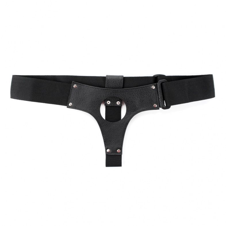 Трусики для страпона, изготовлены из кожи. Крепятся при помощи широких лент. Размер легко меняется при помощи застежки. Диаметр отверстия для страпона - 5,5 см.