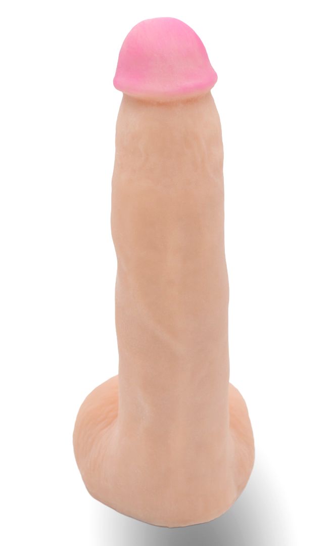 Это распространенный размер, подходящий большинству рожавших женщин. Реалистик имеет изгиб. За счет этого его можно вращать на бобышке, менять направление и даже ласкать мошонкой клитор. Имеет характеристики эрегированного мужского пениса. Рабочая длина - 17 см. Диаметр головки - 4 см.